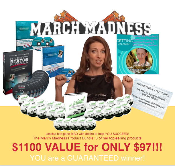 If you answered YES to one or more questions YOU must have Jessica Sitomer’s March Madness Product Bundle!!!  $1100 worth of products for only $97! The bundle includes:Triple Your Contacts $97, Celebrity Status Formula $249, Get Employers to Call You $97,And Action Home Study Program $295, Getting an Agent $97, 101 Obstacles in Entertainment and How to Overcome Them  Ebook $20, Live Greenlight Marketing Blueprint Interactive Teleseminar + Home Study Program $245